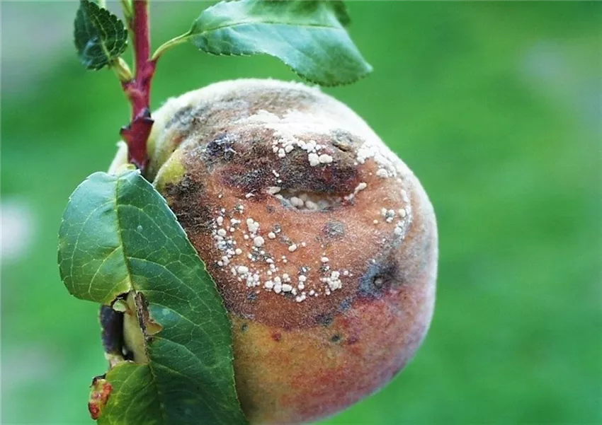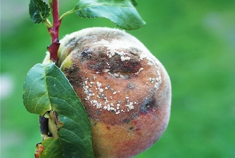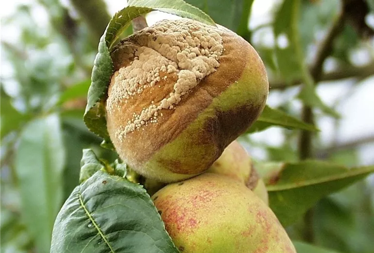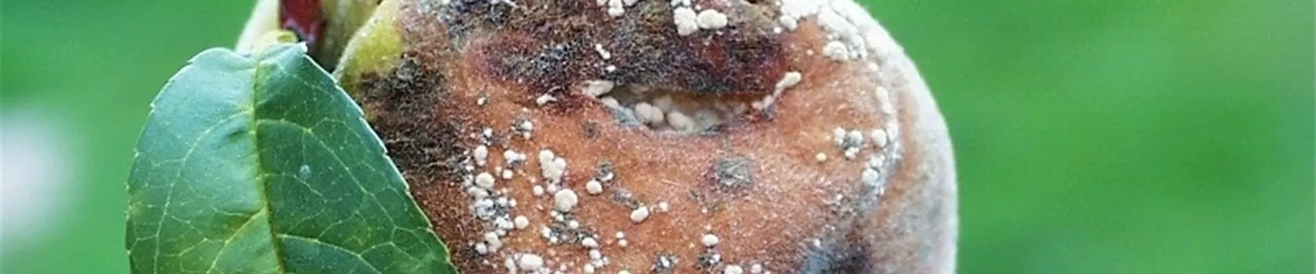Die Sporen des Monilia Pilzes (Monilia laxa, Monilia fructigena) dringen über Wunden in den Pfirsich ein und zerstören sehr schnell das Fruchtfleisch, welches sich braun verfärbt. Die Schimmelpolster bestehen aus Unmengen von Sporen, die die Krankheit verbreiten.