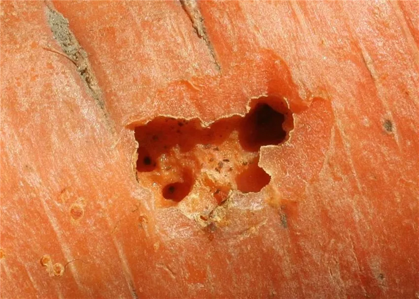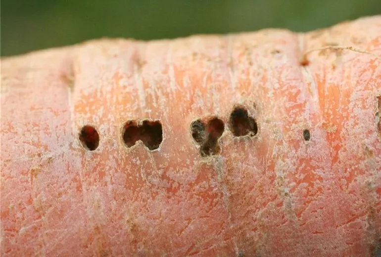 Bei der Ernte fallen löchrige Fraßstellen am Möhrenkörper auf, die bis weit in das Innere der Rübe hineingehen können. Diese Schäden werden von der kleinen Gartenwegschnecke verursacht.