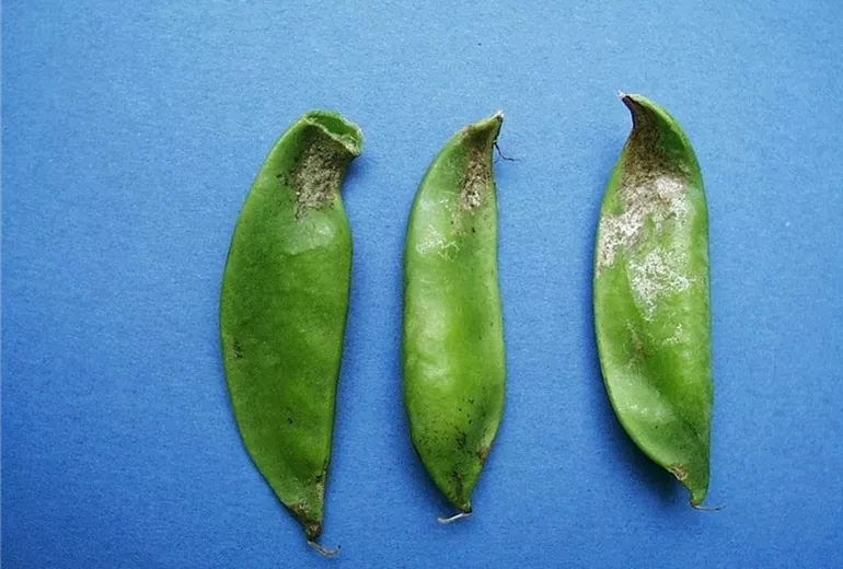 Die jungen Hülsen sind deformiert und zeigen eine silbrig graue Oberfläche. Mit einer Lupe kann man die 2 mm langen, bräunlich gelben Tiere erkennen. Die Larven sind gelb orange gefärbt.
