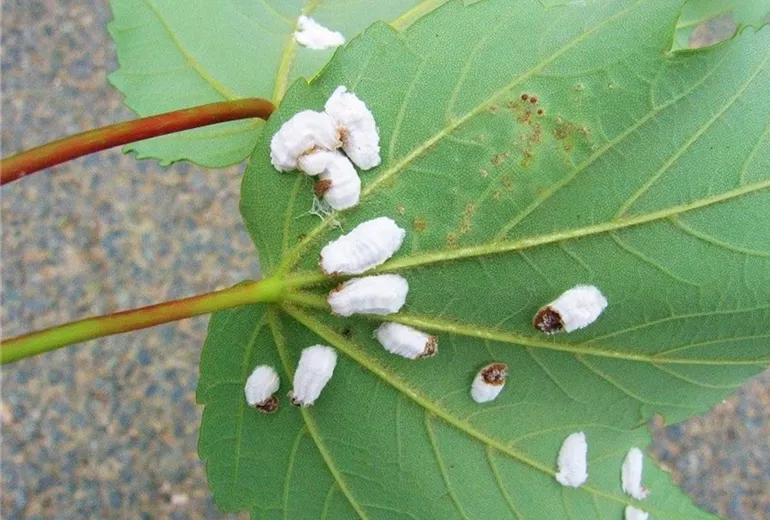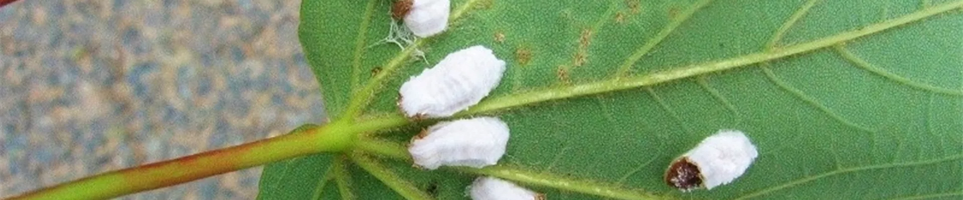 Bevorzugt auf der Blattunterseite der immergrünen Blätter sitzen längliche wollig weiße Eisäcke und evtl. auch die braunen Schilde der Schildläuse. Bei stärkerem Befall kann es zu massiver Honigtaubildung kommen.