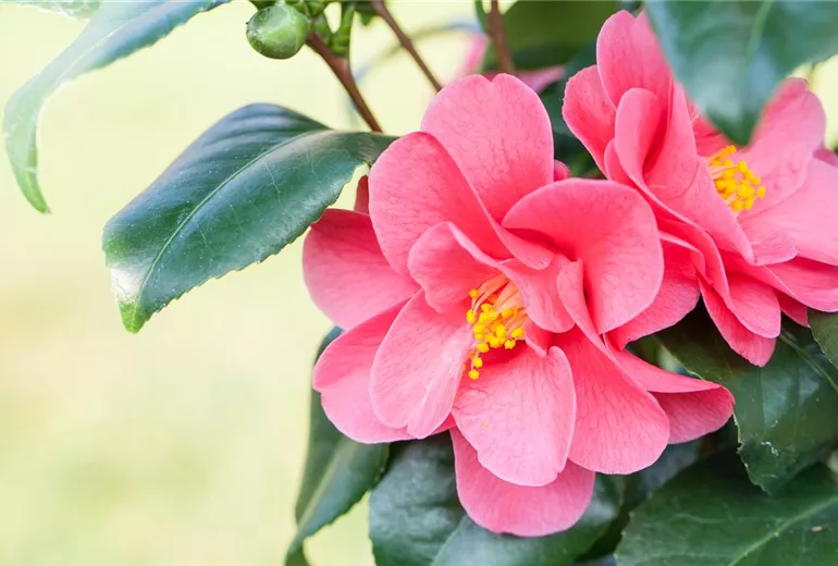 Kamelien ( Camellia japonica ) blühen früh und sind auch das restliche Jahr mit Ihren glänzenden Blättern schön anzusehen. Einige Arten sind recht Winterhart, die anderen lassen sich gut im Kübel pflegen. Die Auswahl an Sorten ist riesig. Damit die Pflanzen gut gedeihen, brauchen sie einen halbschattigen bis sonnigen Standort. Im Winter allerdings sollten sie vor zu viel Sonne geschützt werden. Ansonsten verdunstet über das Laub mehr Wasser als die Kamelie aus dem kalten oder gefrorenen Boden nachziehen kann und die Pflanzen vertrocknen. Der Boden sollte für Kamelien leicht sauer sein. Um das zu erreichen, können Sie Torf oder Rhododendronerde nehmen. Ist Ihre Kamelie zu groß geworden, ist der beste Schnittzeitpunkt nach der Blüte.