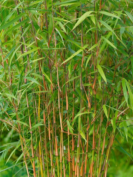 Der Purpurne Bambus (Fargesia scabrida) ist mit seiner dunkelgrünen Blattfärbung ein dekoratives Gestaltungselement im Garten. Das Besondere an ihm ist, nebst der aufrechten, breiten und horstbildenden Form, dass er keine Rhizomsperre braucht! Bevorzugt werden sonnige bis halbschattige, luftfeuchte Standorte mit einem durchlässigen Boden. Bei günstigen Bedingungen erreicht dieser winterharte Bambus eine Höhe von ca. 4 m und wird bis zu 4 m breit.