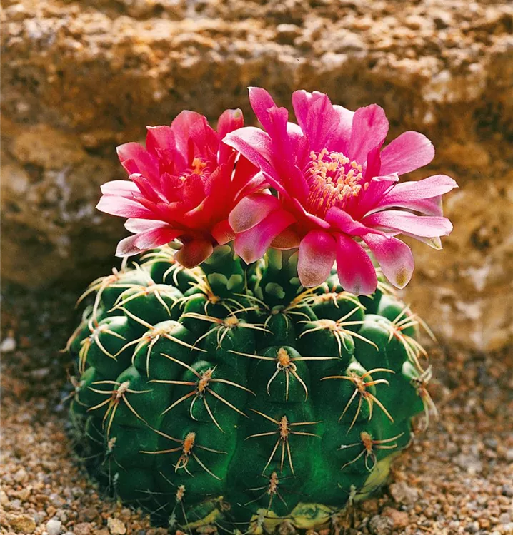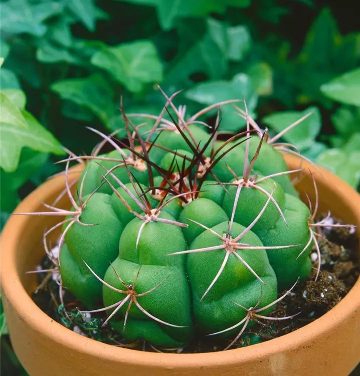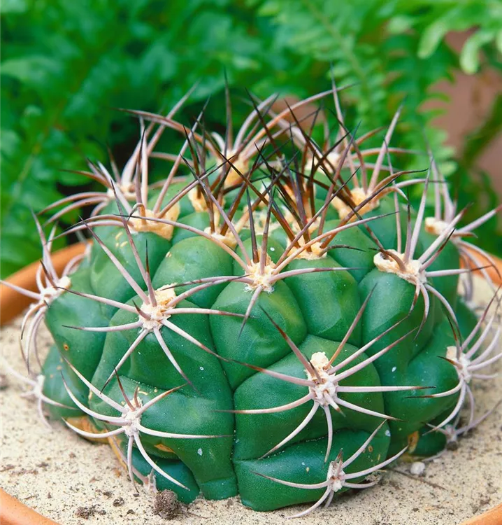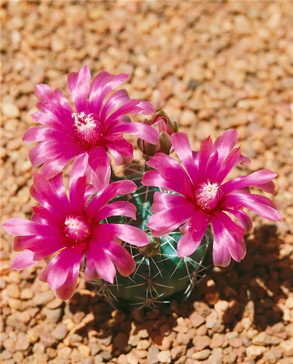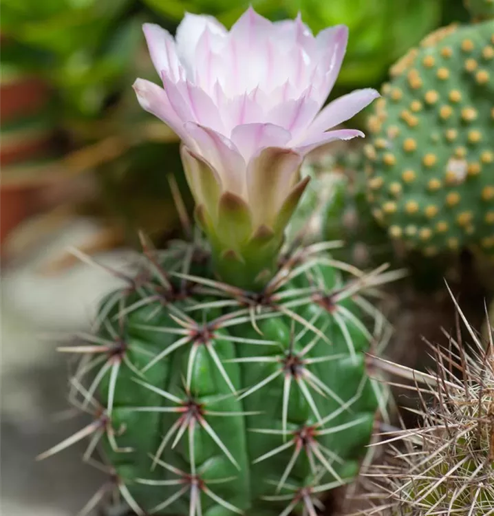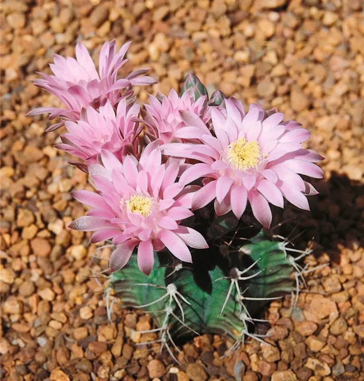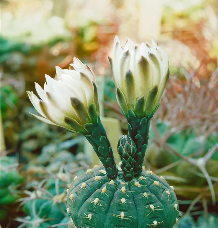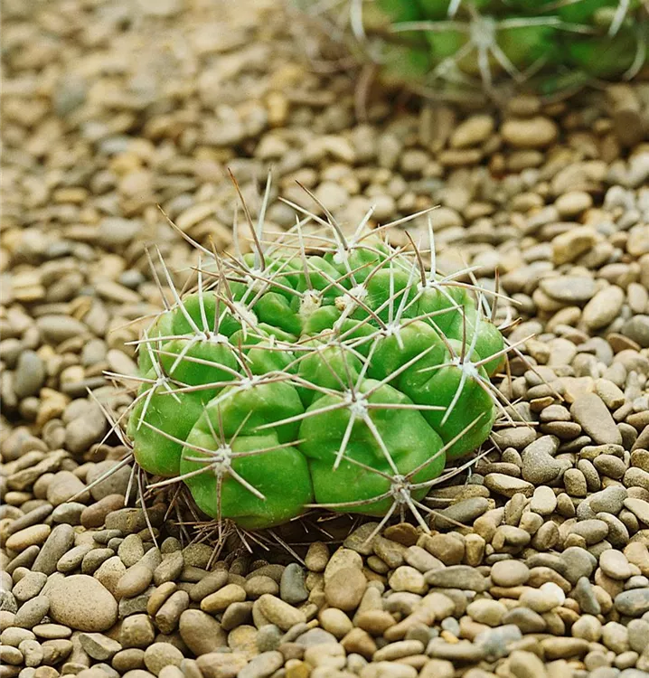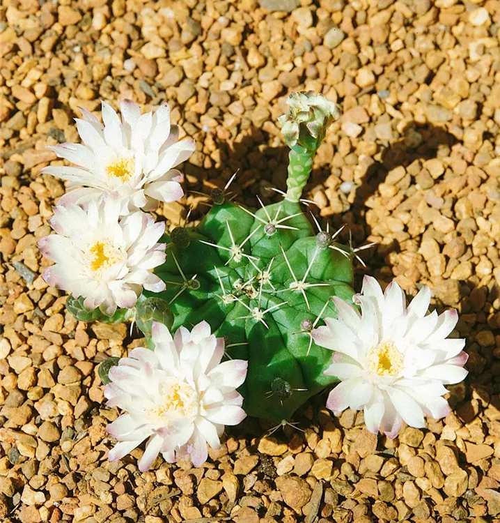 Die Gymnocalycium (Gymnocalycium anisitsii) blüht über Monate hinweg mit dekorativen Blüten. Je nach Sorte, erscheinen diese in den Farben Cremeweiß und Weiß. Diese kugelförmige Pflanze bevorzugt einen halbschattigen Standort und eine durchlässige Pflanzenerde.