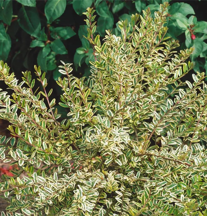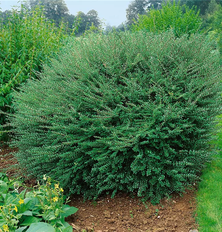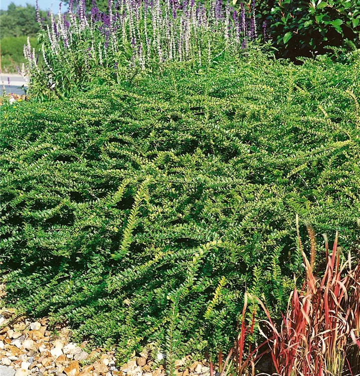 Die Immergrüne Heckenkirsche (Lonicera nitida) ein aufrechter, breiter Kleinstrauch, der, je nach Sorte, Blüten in verschiedenen Farben hervorbringt. An einem sonnigen bis halbschattigen Standort mit nährstoffreichem, lehmigem Boden erreicht sie gewöhnlich eine Höhe von ca. 1 m und wird ca. 1 m breit.