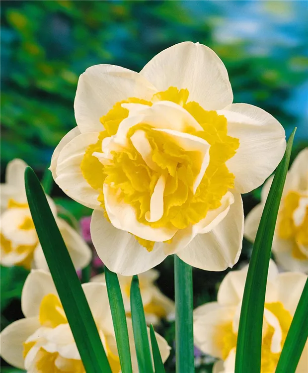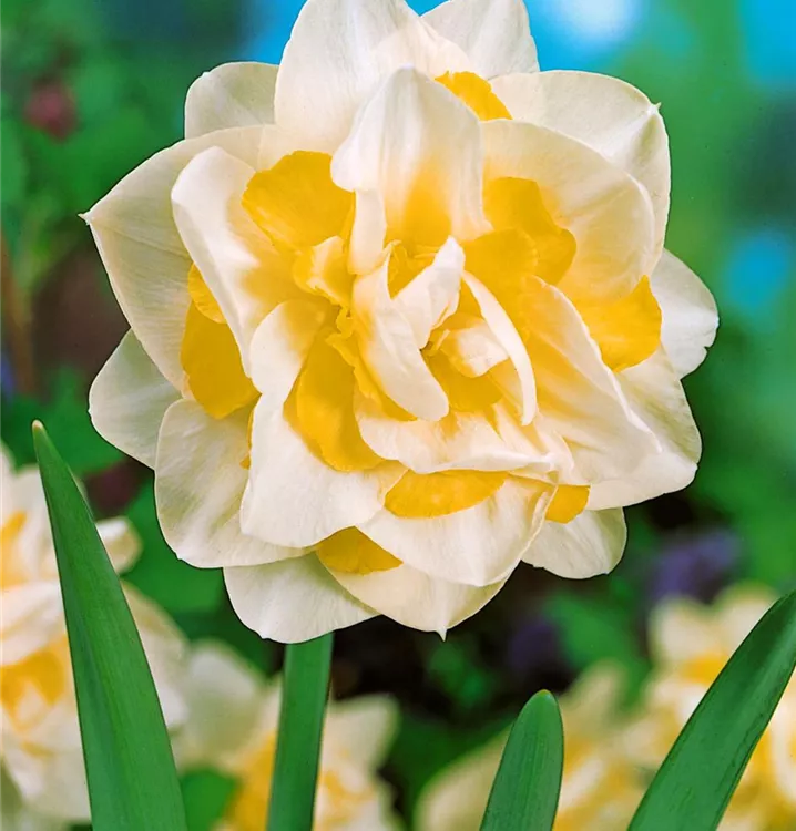 Die gelb-weißen, gefüllten, radförmigen oder röhrenförmigen Blüten der Narzisse 'Double Pam' erscheinen in Trauben im April. Diese sind angenehm duftend.
