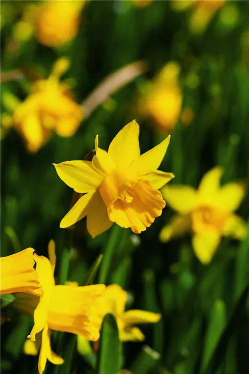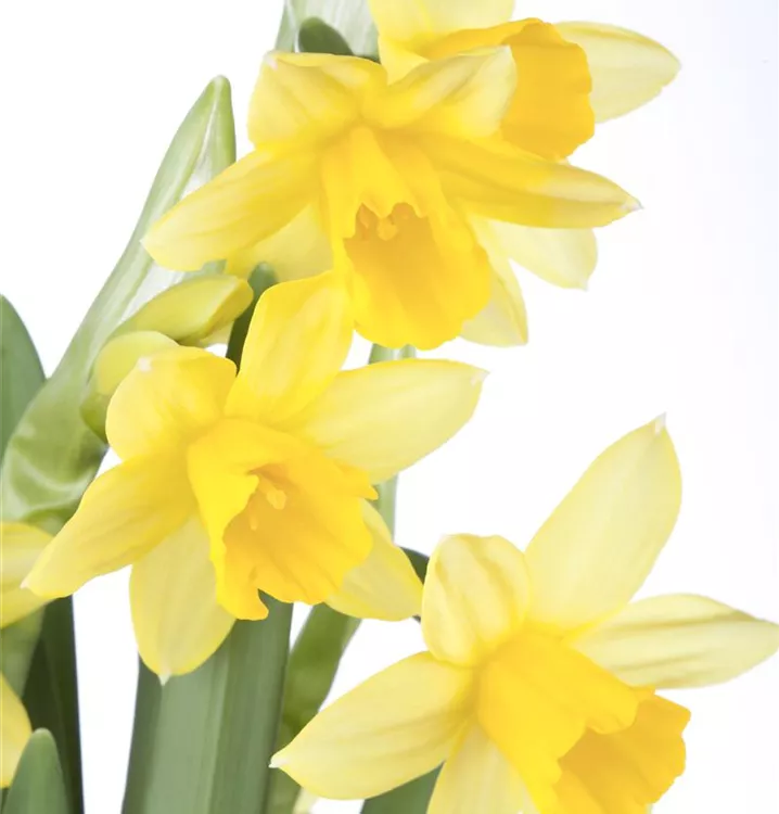 Die gelben, radförmigen oder röhrenförmigen Blüten der Alpenveilchenartigen Garten-Narzisse 'Tête à Tête' erscheinen in Trauben von März bis April. Diese sind angenehm duftend.