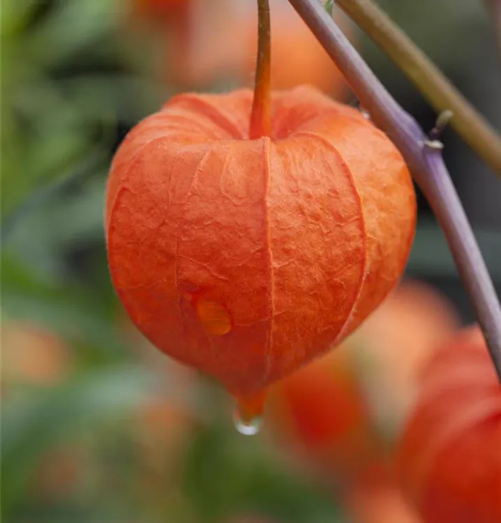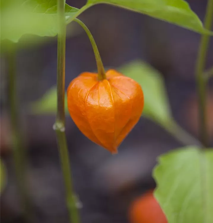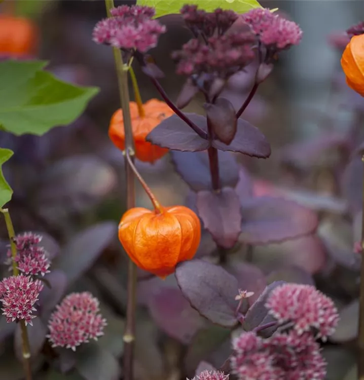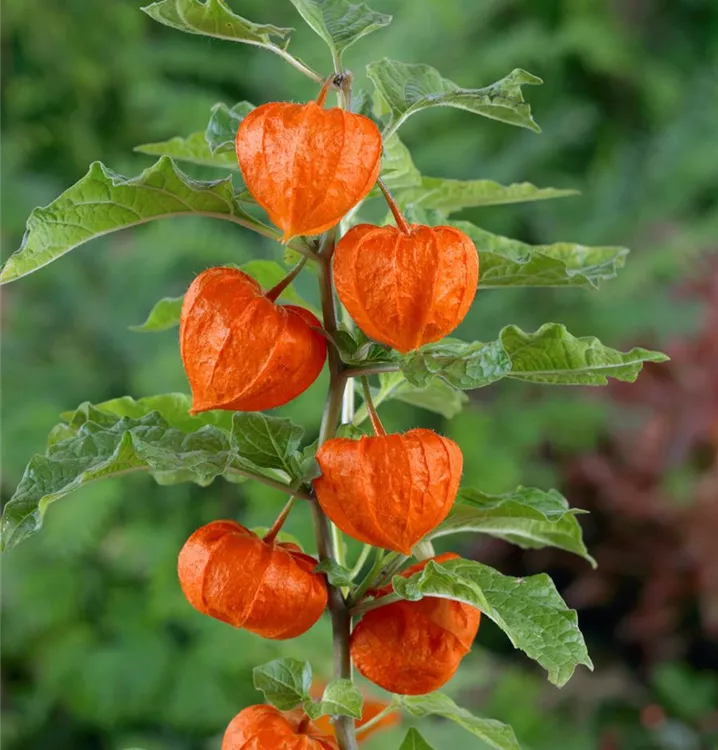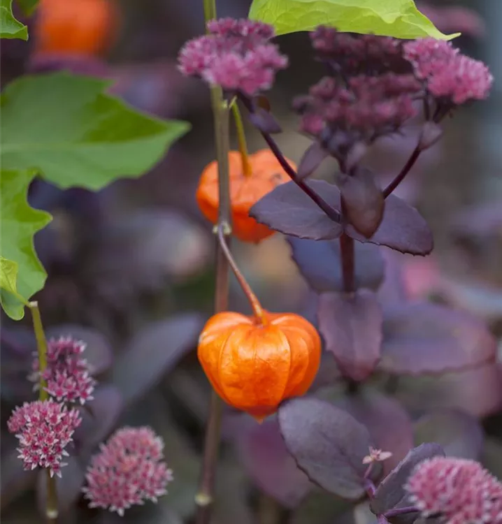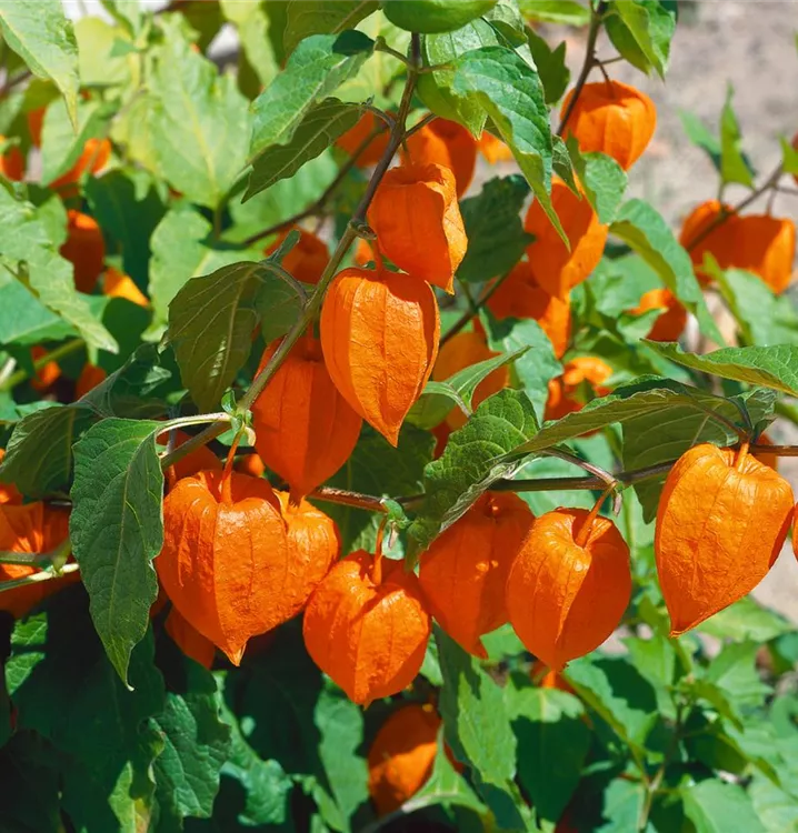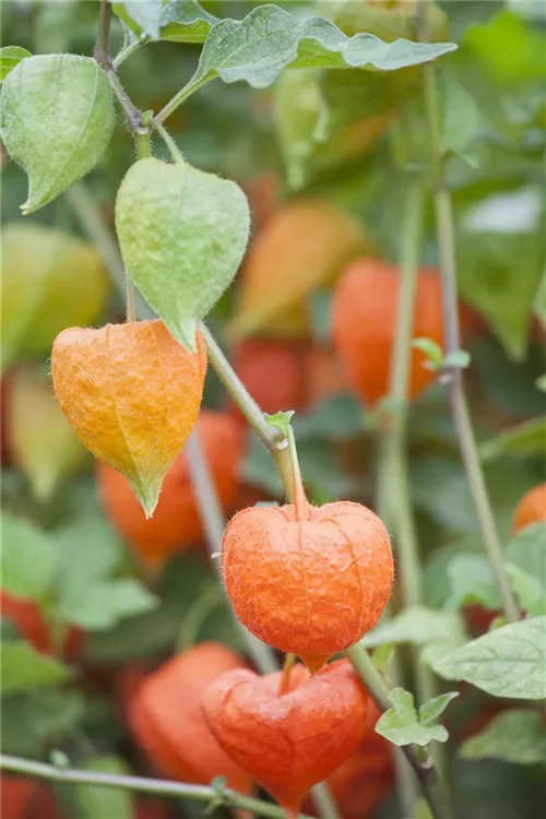 Besonders dekorativ sind die orangefarbenen Beeren von Physalis alkekengi var. franchetii. Diese erscheinen ab Oktober.