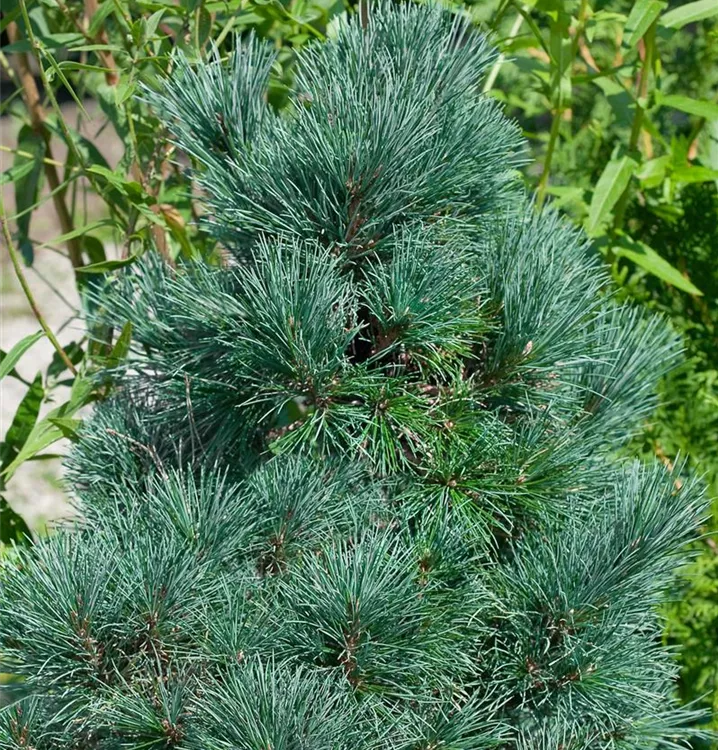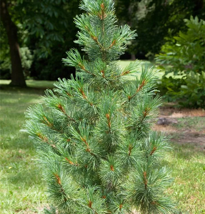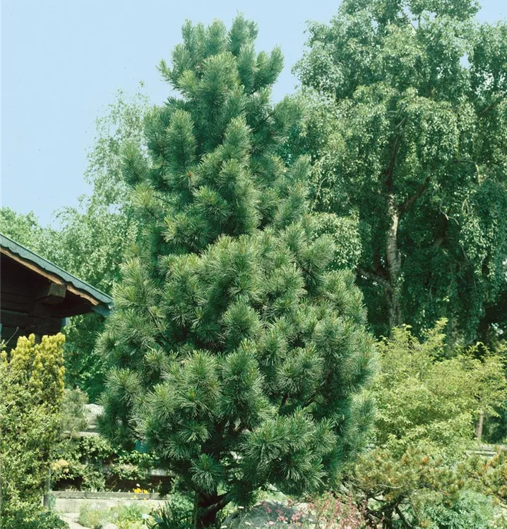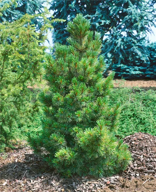 Zirbelkiefer ist ein pyramidal wachsender, malerischer Baum mit lockerer Krone. Ihre dunkelgrünen Blätter sind nadelförmig . An einem sonnigen Standort mit durchlässigem Boden erreicht sie gewöhnlich eine Höhe von ca. 25 m und wird ca. 8 m breit.