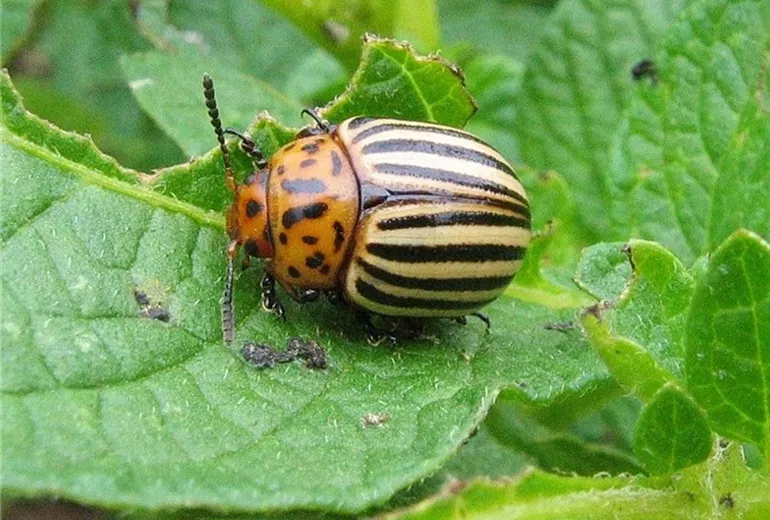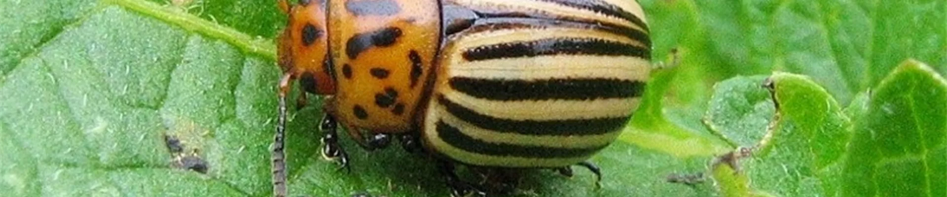 An den Kartoffelblättern fressen rötliche Larven mit dickem Hinterleib und halbkugelige Käfer, deren Flügeldecken beige und schwarz gestreift sind.