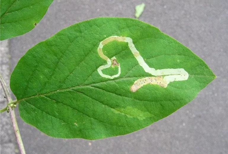 An Heckenkirche oder Geißblatt können verschiedene Minierfliegenarten aber auch Miniermotten Fraßschäden verursachen.