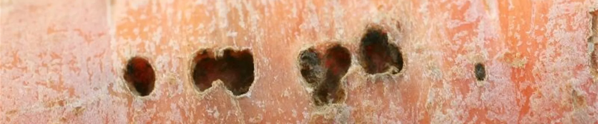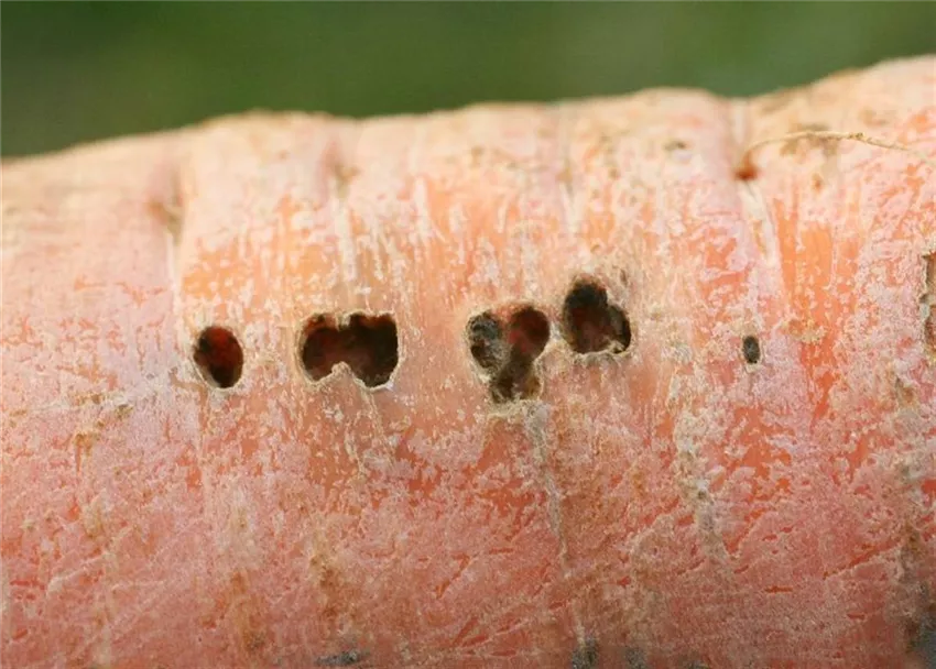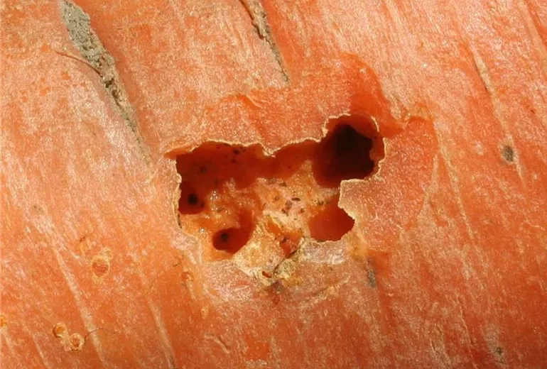 Bei der Ernte fallen löchrige Fraßstellen am Möhrenkörper auf, die bis weit in das Innere der Rübe hineingehen können. Diese Schäden werden von der kleinen Gartenwegschnecke verursacht.
