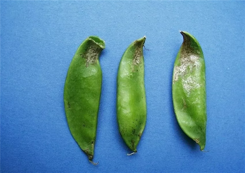 Die jungen Hülsen sind deformiert und zeigen eine silbrig graue Oberfläche. Mit einer Lupe kann man die 2 mm langen, bräunlich gelben Tiere erkennen. Die Larven sind gelb orange gefärbt.