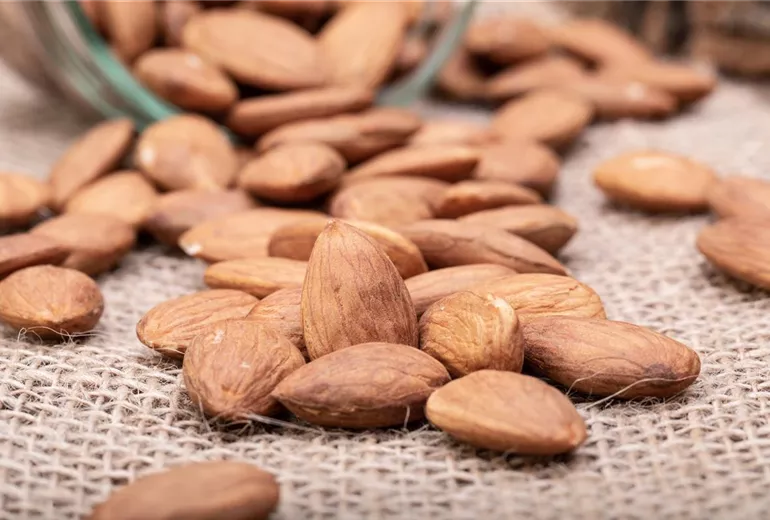 Wenn die Außenschale der Steinfrucht am Mandelbaum aufbricht, wird es langsam Zeit für die Mandelernte. Im August oder September ist es soweit. Die aufgespaltenen Steinfrüchte fallen dann vom Baum und geben ihren heiß begehrten Inhalt, die Mandeln, preis. Sie können jedoch auch direkt vom Baum geerntet werden, bevor sie herunterfallen. Einige Tage sollte man damit aber dennoch warten, denn durch die aufgebrochene Hülle trocknen die Mandeln mit Hilfe der Sonne besser aus, was den Reifeprozess fördert. Sonst machen sich auch Eichhörnchen und Vögel über die seltene Leckerei her. Eine Plane, die rund um den Mandelbaum ausgebreitet wird, erleichtert das Auflesen des Ernteguts. Für Mandeln, die weiter oben am Baum hängen, kann eine Teleskopstange bei der Ernte empfehlenswert sein.