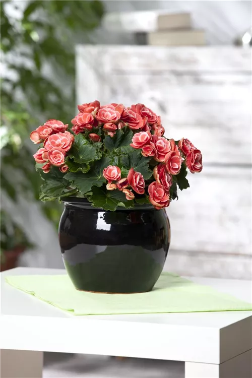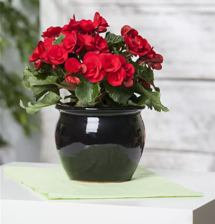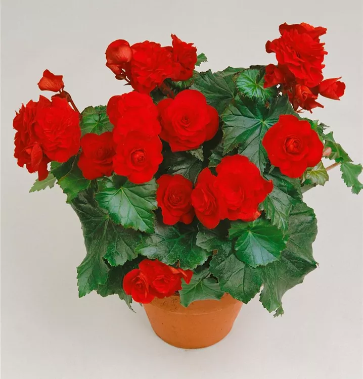 Die Begonie (Begonia elatior) ist eine rot blühende Pflanze, die dreieckige, gesägte Blätter trägt. Ihre schalenförmigen Blüten erscheinen von April bis September. Diese kompakte Pflanze gedeiht am besten an einem sonnigen bis halbschattigen Standort.