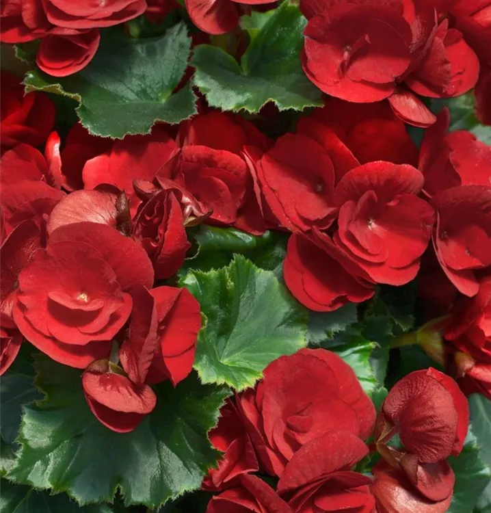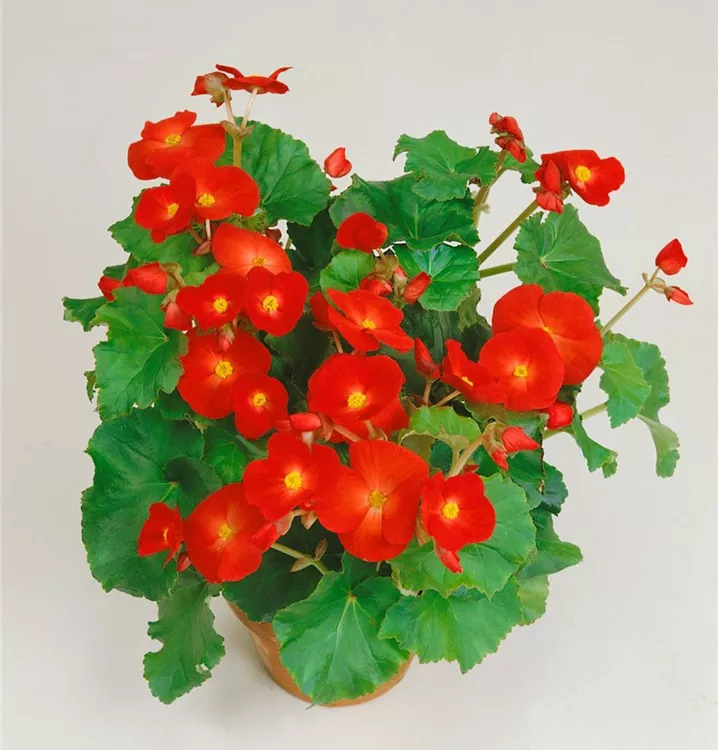 Begonia elatior, rot bildet während der gesamten Saison zahlreiche schalenförmige, rote Blüten.