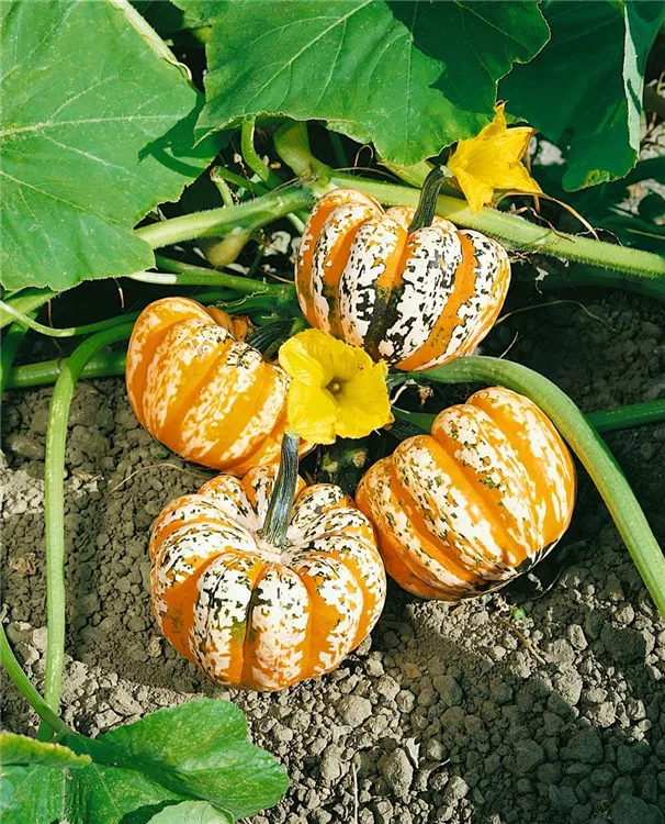 Der Kürbis 'Festival' (Cucurbita pepo) bildet Früchte, die aromatisch schmecken und bereits ab September geerntet werden können. Für das optimale Wachstum des Kürbises 'Festival' werden ein sonniger Standort und durchlässiger, nährstoffreicher Boden benötigt.