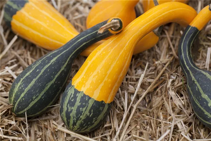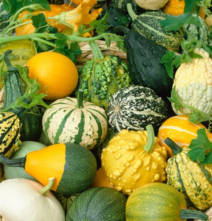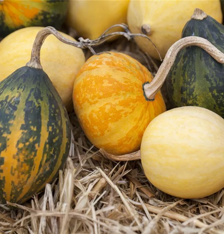 Der Zierkürbis 'Jeanny' (Cucurbita pepo) bildet Früchte, die aromatisch schmecken und bereits ab September geerntet werden können. Für das optimale Wachstum des Zierkürbises 'Jeanny' werden ein sonniger Standort und durchlässiger, nährstoffreicher Boden benötigt.