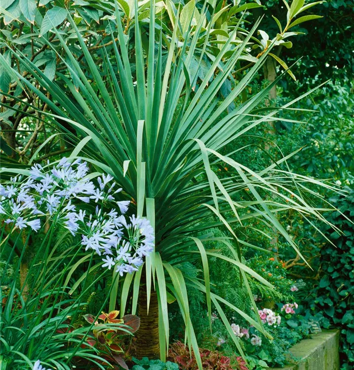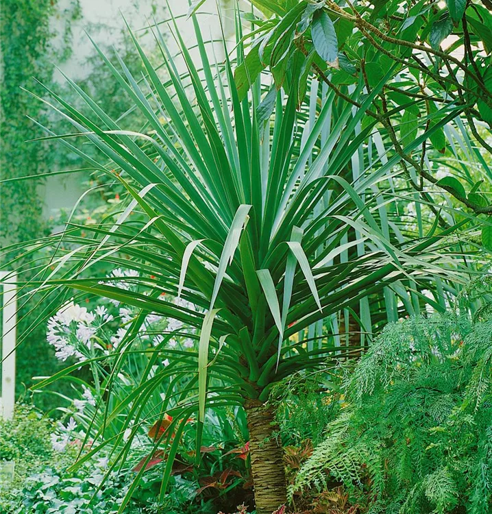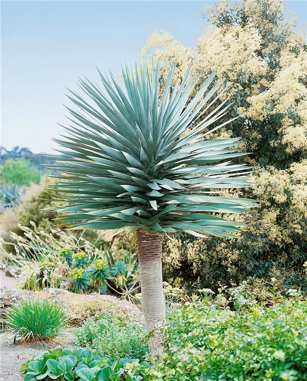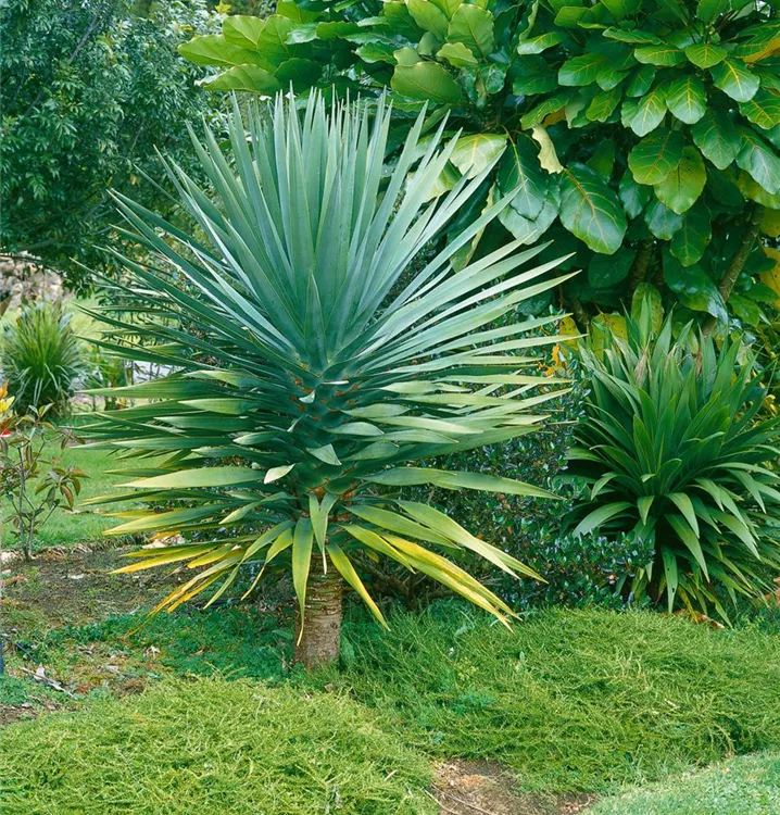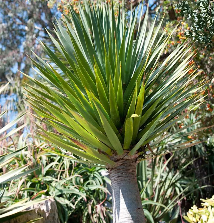 Der Drachenbaum (Dracaena draco) trägt blau-grüne Blätter. Diese aufrechte Pflanze gedeiht am besten an einem sonnigen bis halbschattigen Standort.