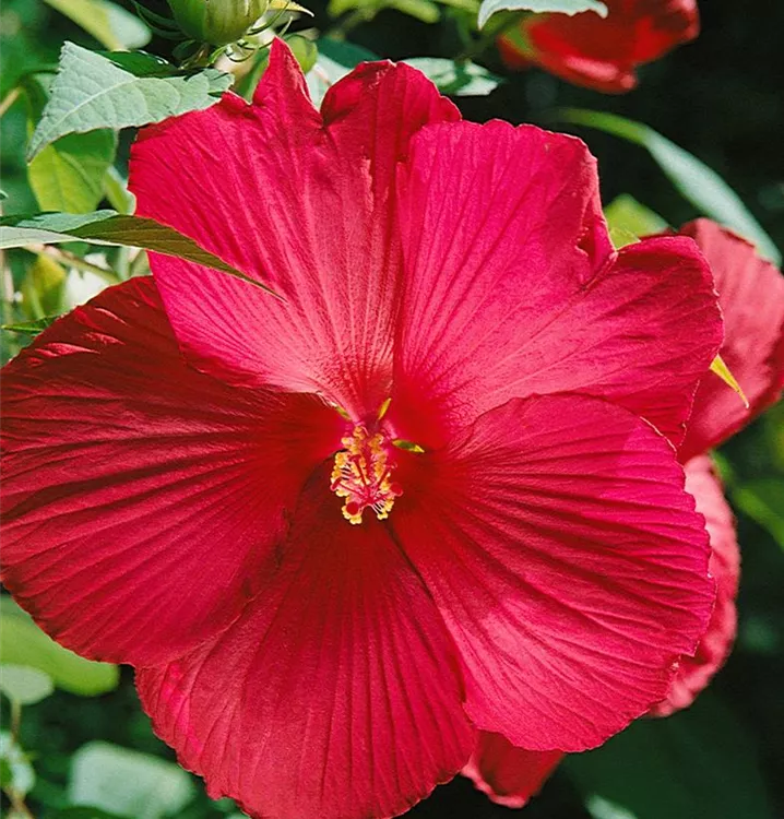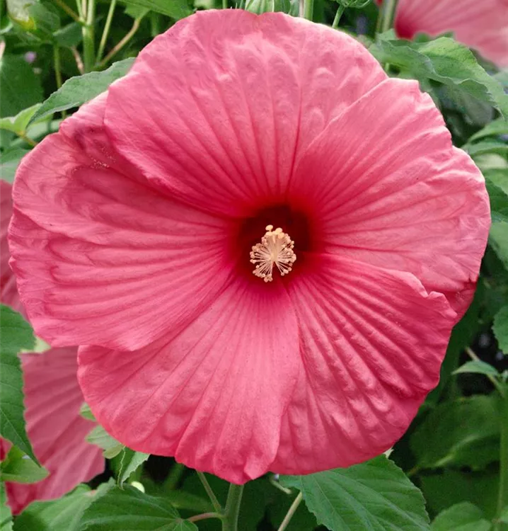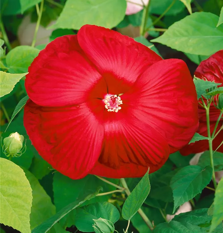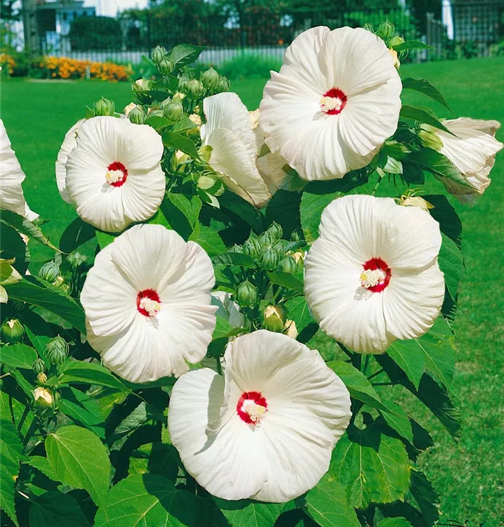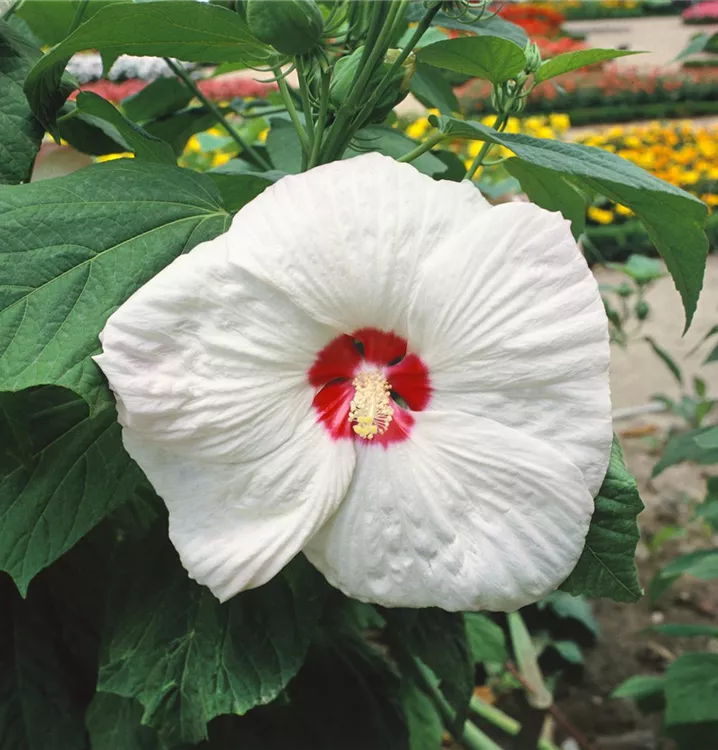 Der Garten-Eibisch (Hibiscus moscheutos) ist eine buschige Staude, die, je nach Sorte, Blüten in verschiedenen Farben bildet. An einem sonnigen Standort mit durchlässigem Boden erreicht er gewöhnlich eine Höhe von ca. 1 m und wird ca. 80 cm breit. Der Garten-Eibisch ist an geschützten Standorten gut frostverträglich.