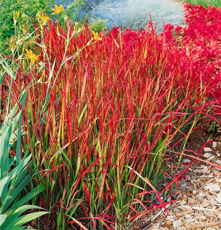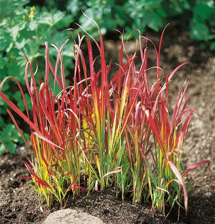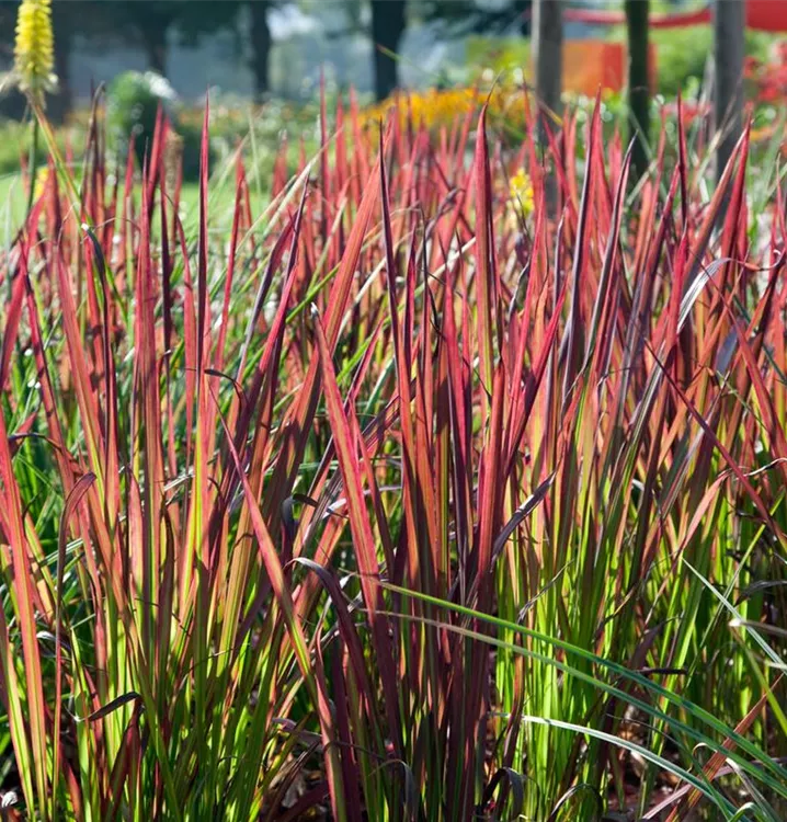 Das Japanische Blutgras (Imperata cylindrica) ist ein dekoratives Gestaltungselement im Garten, welches sich an einem sonnigen Standort mit einem möglichst durchlässigen, humosen, nährstoffreichen Boden am wohlsten fühlt. Bei günstigen Bedingungen erreicht dieses winterharte Gras eine Höhe von ca. 40 cm und wird bis zu 40 cm breit.