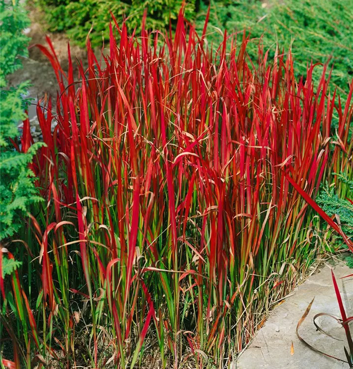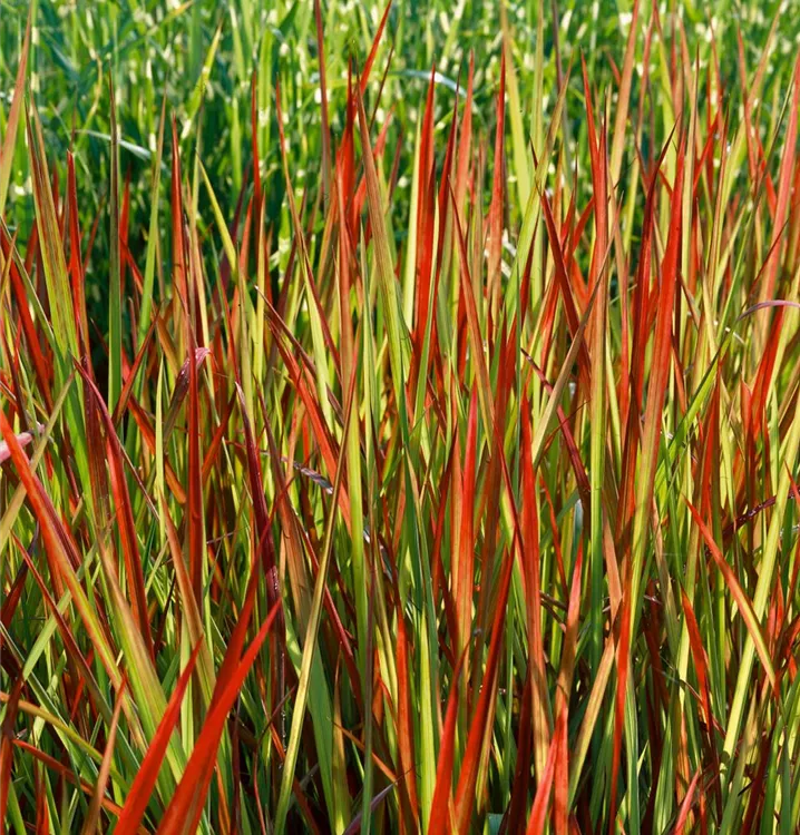 Das Garten-Blutgras 'Red Baron' (Imperata cylindrica) ist mit seiner grün-roten Blattfärbung ein dekoratives Gestaltungselement im Garten, welches sich an einem sonnigen Standort mit einem möglichst durchlässigen, humosen, nährstoffreichen Boden am wohlsten fühlt. Bei günstigen Bedingungen erreicht dieses winterharte Gras eine Höhe von ca. 40 cm und wird bis zu 40 cm breit.