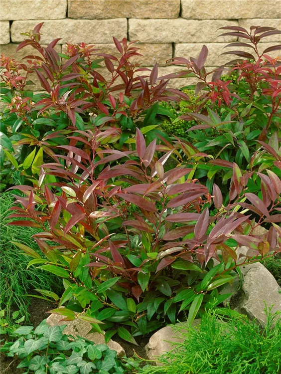 Die immergrünen Blätter der Kleine Traubenheide sind dunkelgrün, lanzettlich, glänzend, gezähnt. Mit seinem karminroten Laub setzt sie schöne Akzente im Winter.