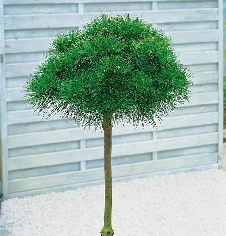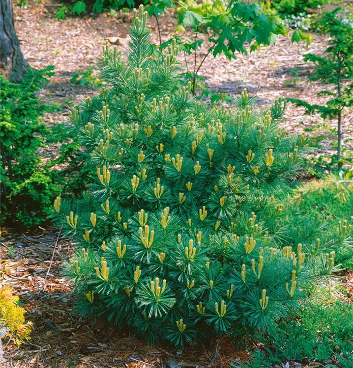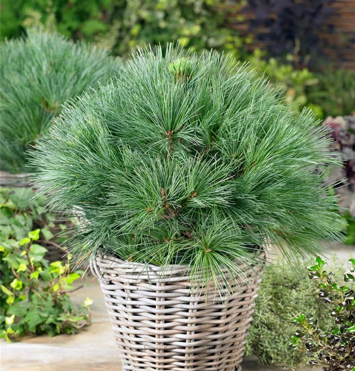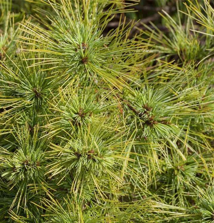 Die Kissen-Kiefer 'Minima' (Pinus strobus) ist ein Kleinstrauch, welcher dicht, kompakt, kugelförmig wächst und gewöhnlich eine Höhe von ca. 1,2 m und eine Breite von ca. 1 m erreicht. Ihre nadelförmigen Blätter haben eine blau-grüne Färbung. Dieses Gehölz ist gut frostverträglich. Sie bevorzugt humosen, lockeren Boden in sonniger bis halbschattiger Lage.