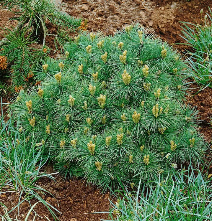 Pinus strobus 'Minima' ist ein Pfahlwurzler und bildet, je nach Boden, ausladend verzweigte Wurzeln.