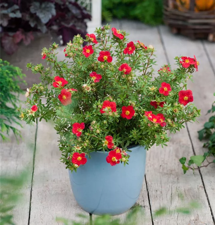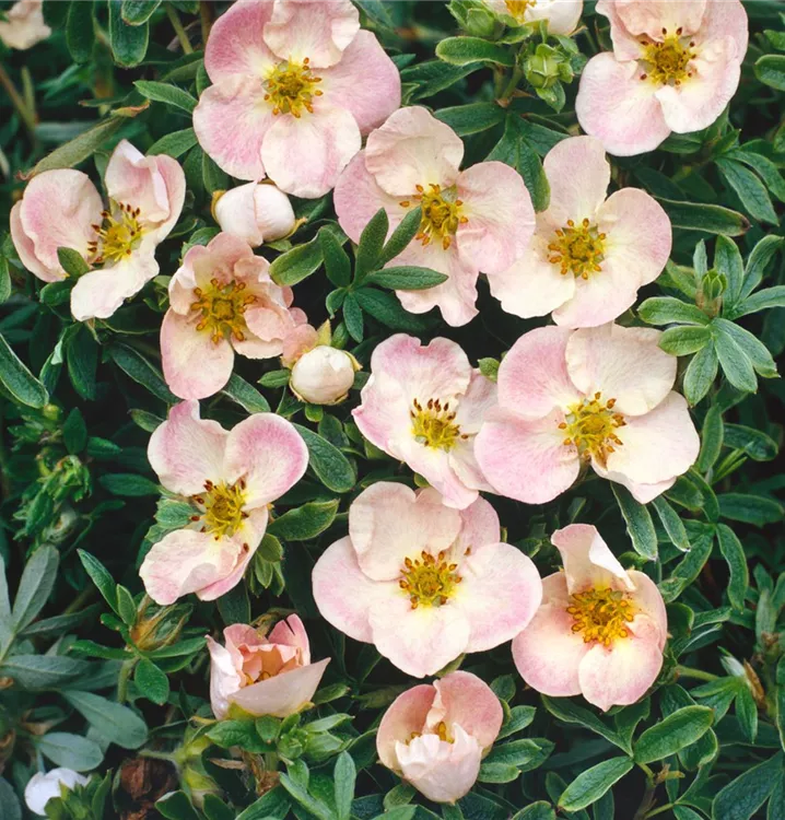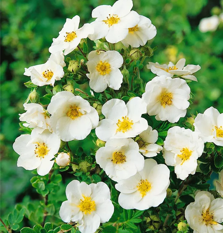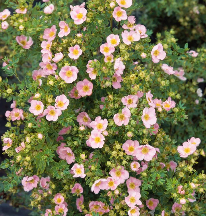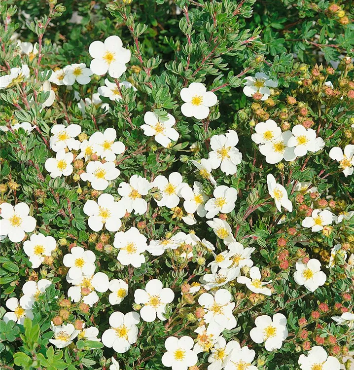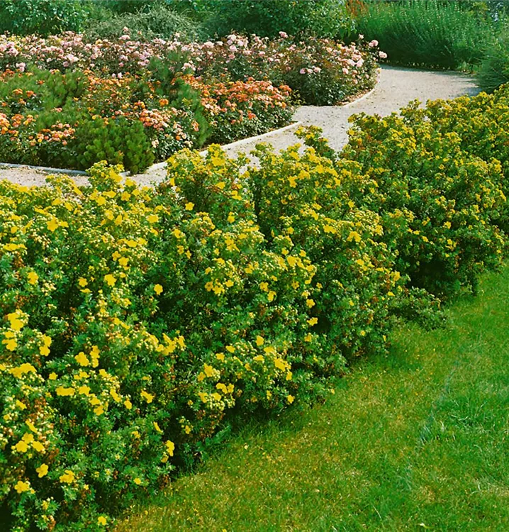 Der Gemeine Fingerstrauch (Potentilla fruticosa) ein buschiger, breiter Kleinstrauch, der, je nach Sorte, schalenförmige Blüten in verschiedenen Farben hervorbringt. An einem sonnigen bis halbschattigen Standort mit durchlässigem, nährstoffreichem Boden erreicht er gewöhnlich eine Höhe von ca. 1,5 m und wird ca. 1,5 m breit.