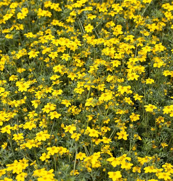 Die gelben, schalenförmigen Blüten erscheinen von Juni bis Oktober.