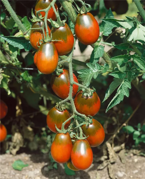 Die Tomate 'Schwarze Pflaume' (Solanum lycopersicum) bildet Früchte, die aromatisch, süß, saftig schmecken und bereits ab Juli geerntet werden können. Für das optimale Wachstum der Tomate 'Schwarze Pflaume' werden ein sonniger Standort und durchlässiger, nährstoffreicher Boden benötigt.