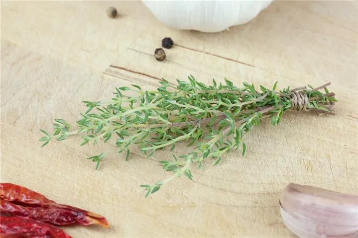 Der Orangen-Thymian (Thymus vulgaris) ist eine Kräuterpflanze mit einem aromatischen, würzigen Geschmack. Seine mittelgrünen Blätter sind rundlich. Für das optimale Wachstum des Orangen-Thymians werden ein sonniger Standort und durchlässiger, nährstoffreicher Boden benötigt.